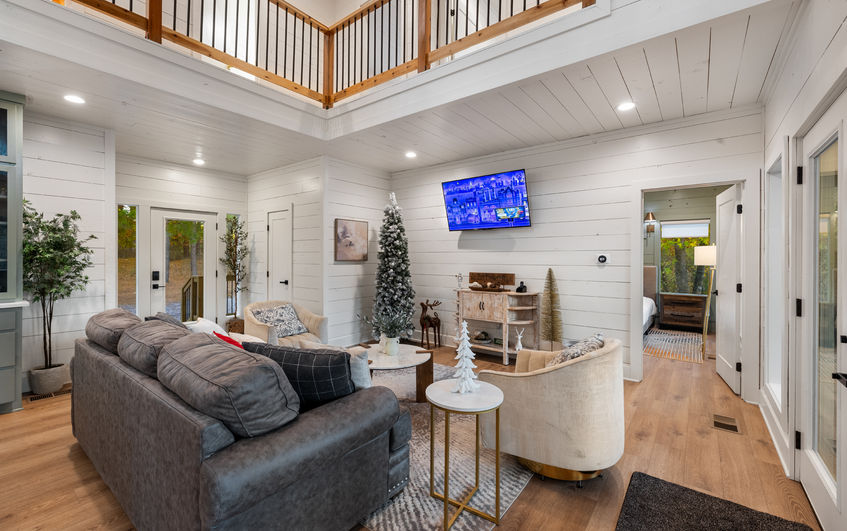 Step inside to an inviting open-concept space with tall ceilings, a cozy gas fireplace, and modern cabin charm.