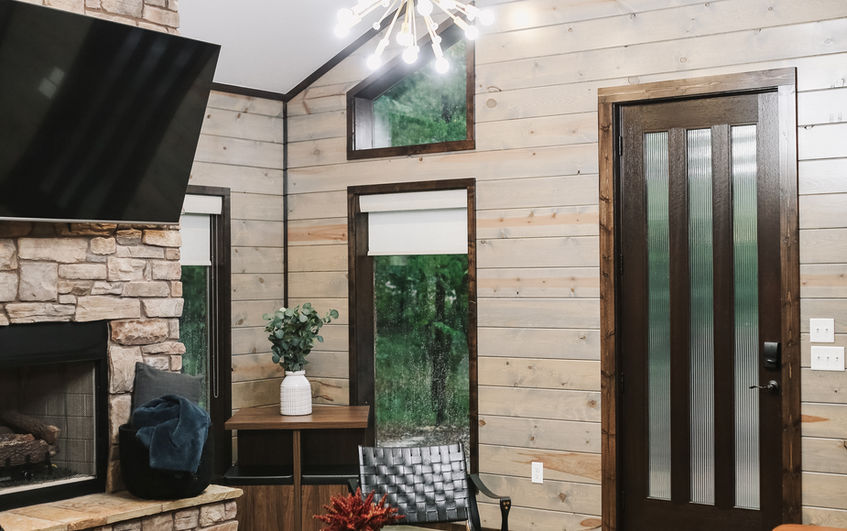 The Interstellar cabin has a 1 story open floorplan with soaring ceilings and an indoor fireplace, where guests will enjoy relaxing at the end of the day in the comfiest leather sofa with deep seating. High-speed WIFI, a smart TV, a Pacman Arcade, and family-friendly board games will also keep guests entertained throughout the stay.