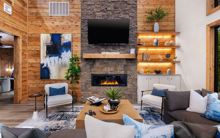 Tall ceilings and an open floor plan enhance the modern, airy feel, providing ample room for dining and relaxation. The living room features a comfortable leather sofa, gas fireplace, and SMART TV for streaming.